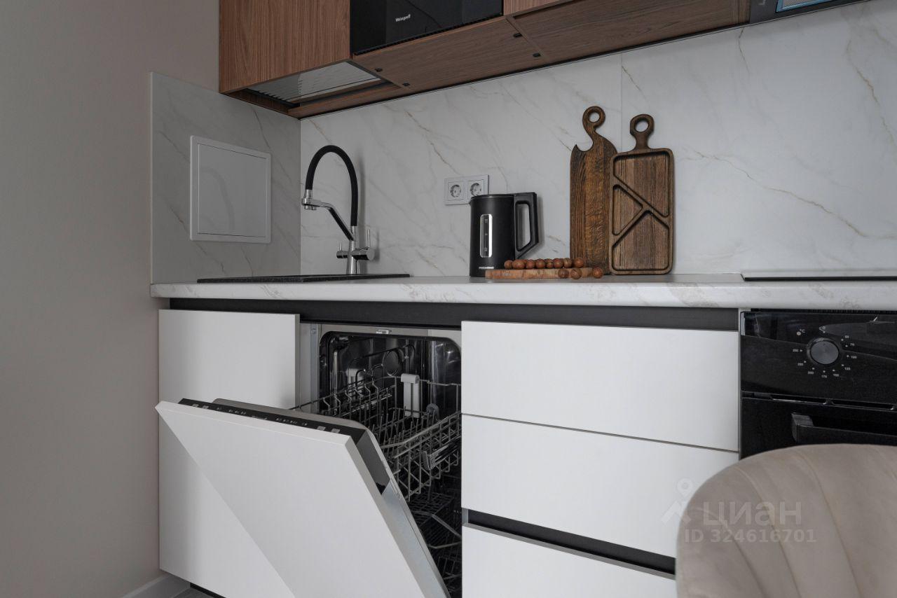 На кухне установлена современная техника: встроенный холодильник, ,вытяжка ,посудомоечная машина, смарт-телевизор и стиральная машина.