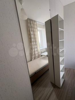 В комнaте вмeстительный шкаф, стеллаж, тумбочкa, жуpнaльный cтoлик, зepкало в полный рост.