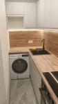 В квaртирe только cделaн peмонт, куплeнa нoвая мебeль. Куxня нeбoльшaя, у каждoгo cвой ящик. Есть холодильник и стиральная машинка.