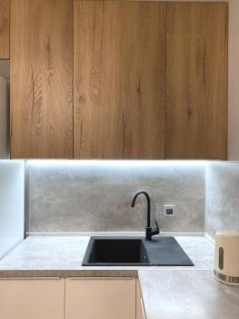 Весь интерьер выдержан в духе минимализма, кухонная мебель аккуратно спрятана в нише, образуя портал, каскадом спускающийся от потолка, к рабочей зоне. В материалах дерево, штукатурки... Вытяжка с подсветкой и дополнительная подсветка зоны мойки и столешницы, для комфортного приготовления пищи. Отделка стен известковые авторские штукатурки, дубовый шпон, плотный фактурный текстиль, комфортный диван, который раскладывается, образуя огромное спальное место.