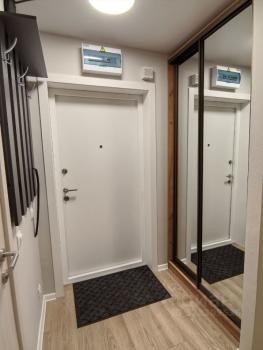 В квартире из прихожей вы попадаете во вместительную гардеробную, закрытое место хранения с дверями купе, система Пакс (фото по запросу). Оставивши обувь и верхнюю одежду, заглянете в ванную комнату, подвесной унитаз, раковина, большая ванна, зеркало с контурной широкой подсветкой и стиральная машина. Всё, что нужно для чистоты тела и вашего гардероба.