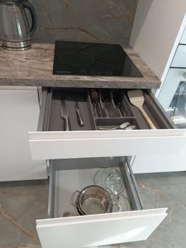 Квартира полностью меблирована и оснащена всей необходимой техникой - плита, духовой шкаф, микроволновка, посудомоечная машина, вытяжка, стиральная машина, телевизор, кондиционер. Есть электрический камин для создания романтического настроения.