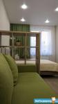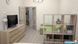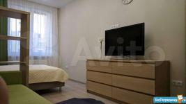 Выполнен качественный ремонт. Вся мебель и техника новые, сдается впервые. Квартира мебелирована и укомплектована всей необходимой техникой для комфортного проживания. Комната разделена на зону спальни (кровать с ортопедическими матрасом) и зону гостиной. Оборудована вместительная гардеробная. Санузел 5,5 кв.м с большой угловой ванной. Лоджия застекленная, выход из кухни.
