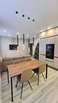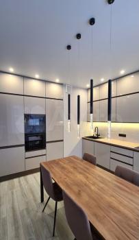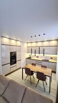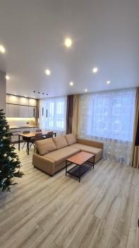 Планировка представляет собой просторную двушку с большой кухней-гостиной, гардеробной и двумя изолированными санузлами - ванная и душевая, спальня с выходом на балкон и детская с выходом на лоджию. В квартире в 2022 году сделан качественный, универсальный и лаконичный ремонт. Квартира оборудована необходимой мебелью и новой современной техникой – холодильник, посудомоечная машина, индукционная плита, микроволновка, духовка, вытяжка, встроенная система фильтрации для питьевой воды, стиральная машинка с сушкой.