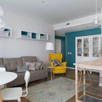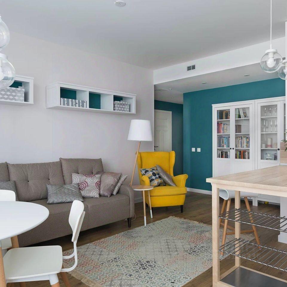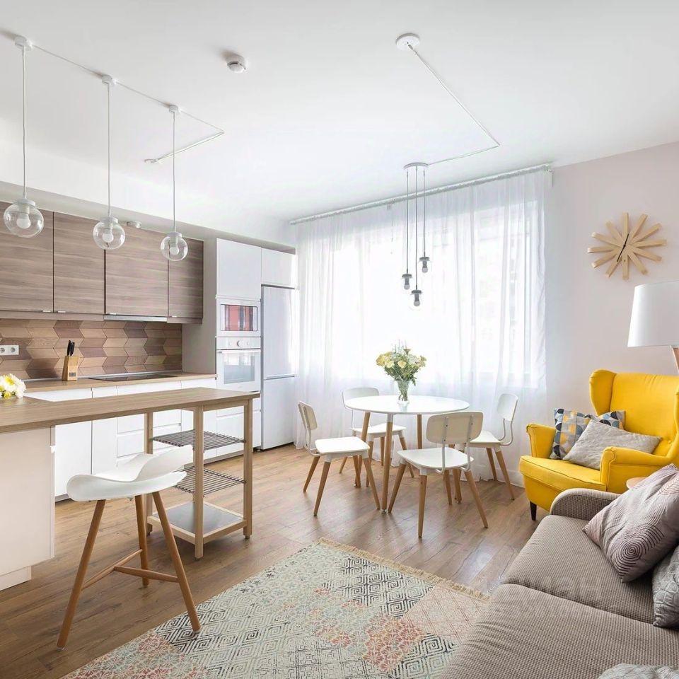 В квартире 2 спальни и большая гостиная- кухня площадью 35 метров с раскладным диваном.