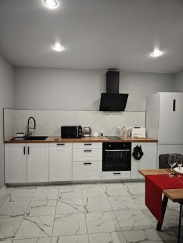 Дом оборудован современной бытовой техникой и оснощен всем необходимым. А именно: тёплые полы, разного уровня освещение, панорамные окна, wifi, совмещеный санузел с тропическим душем, в прихожей и спальне стоят вместительные шкафы, холодильник, электрический духовой шкаф и варочная панель, вытяжка, микроволновая печь, электрический чайник, телевизор, утюг, фен, индивидуальные принадлежности отельного уровня, одноразовые тапочки, сушилка для белья, гладильная доска, мягкие полотенца, пастельное белье, пасуда для готовки и праздничной сервировки, столовые приборы, фужеры и прочая кухонная утварь.