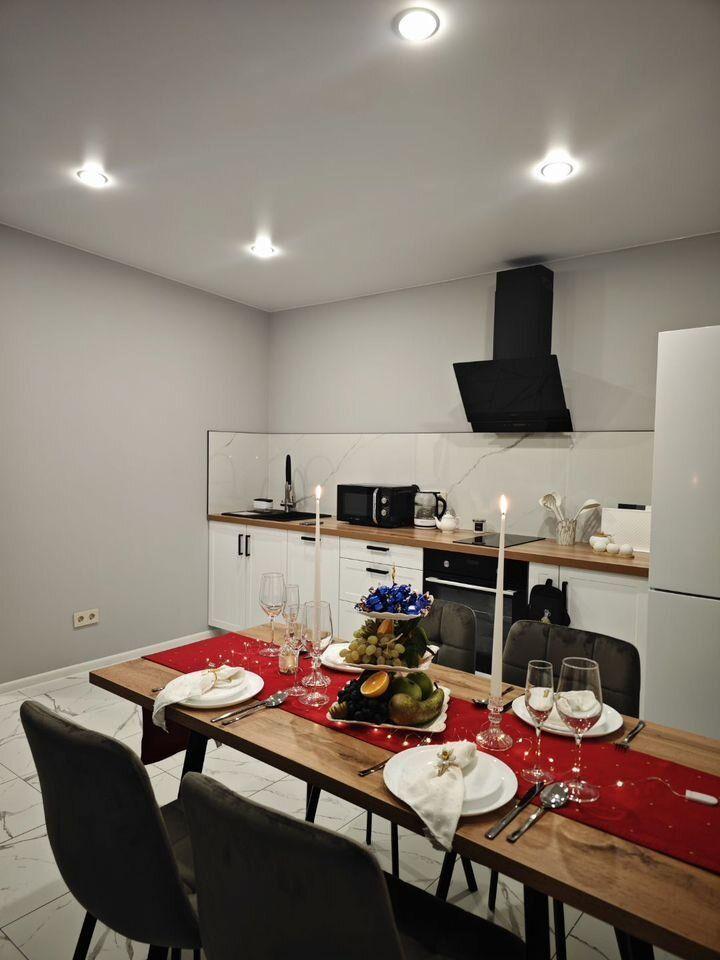 человек с 3-мя спальнями и просторной кухней-гостиной, теплые полы, камин на дровах, 2 санузла , интернет ,Wi-Fi, благоустроенная закрытая придомовая территория: 3 парковочных места, спортивная площадка, летняя кухня с мангальной зоной, баня на дровах (за отдельную плату). Кухонный гарнитур с полным комплектом кухонной и столовой посуды. Электроплита на 4 конфорки и духовой шкаф, холодильник, микроволновка, кофе машина, стиральная и посудомоечная машины.