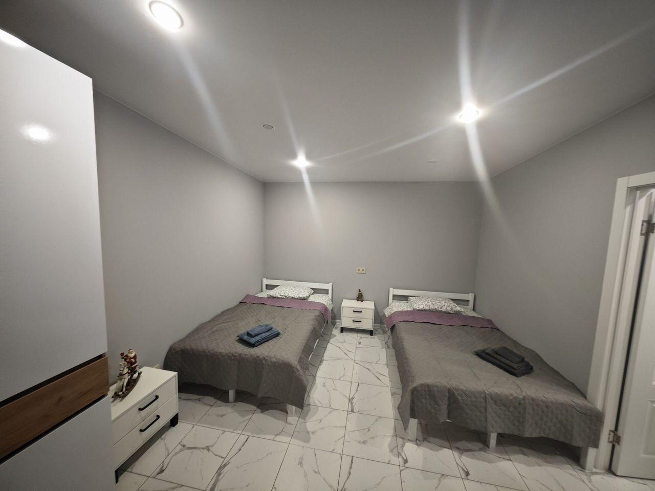 Дом расчитан на 4 спальных места с качественным матрасами. В комнатах стоят одна просторная, двухспальная кровать и 2 кровати размером 120*200.