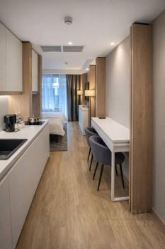санузел - совмещённый, мебель - кухня, хранение одежды, спальные места, холодильник, плита, микроволновка, стиральная машина, посудомоечная машина, телевизор.