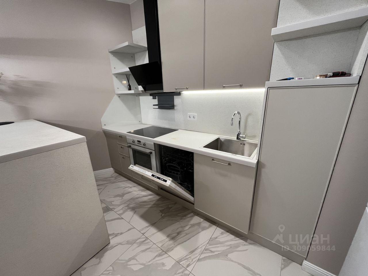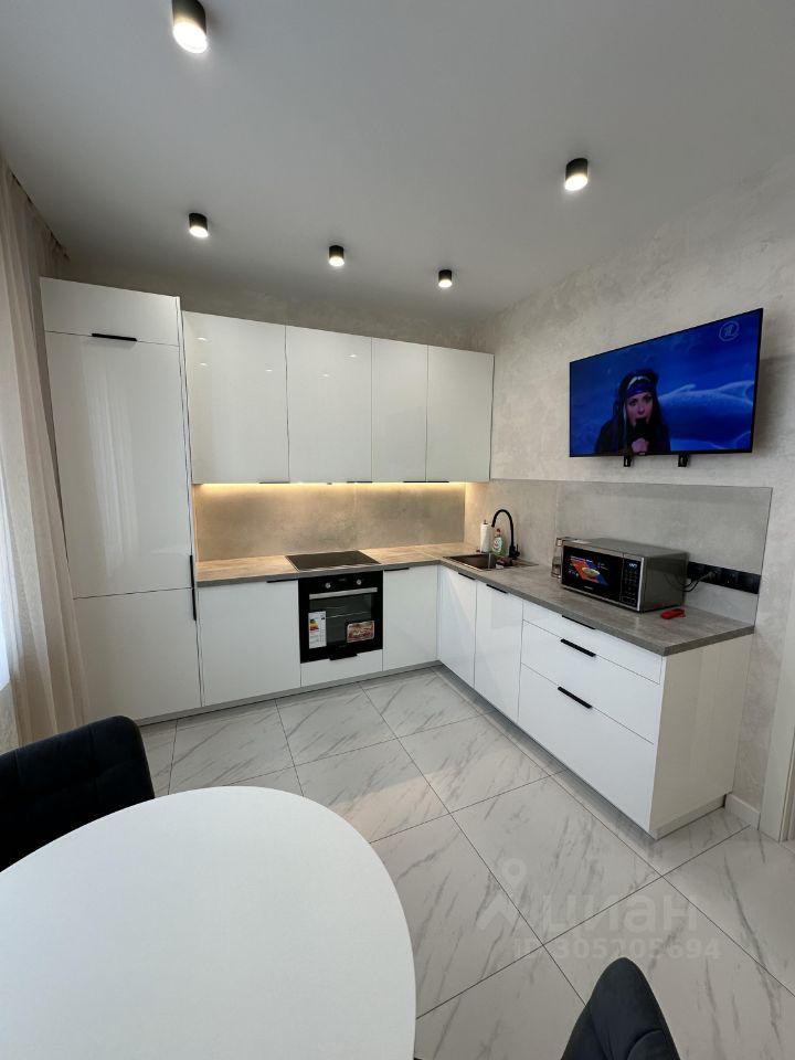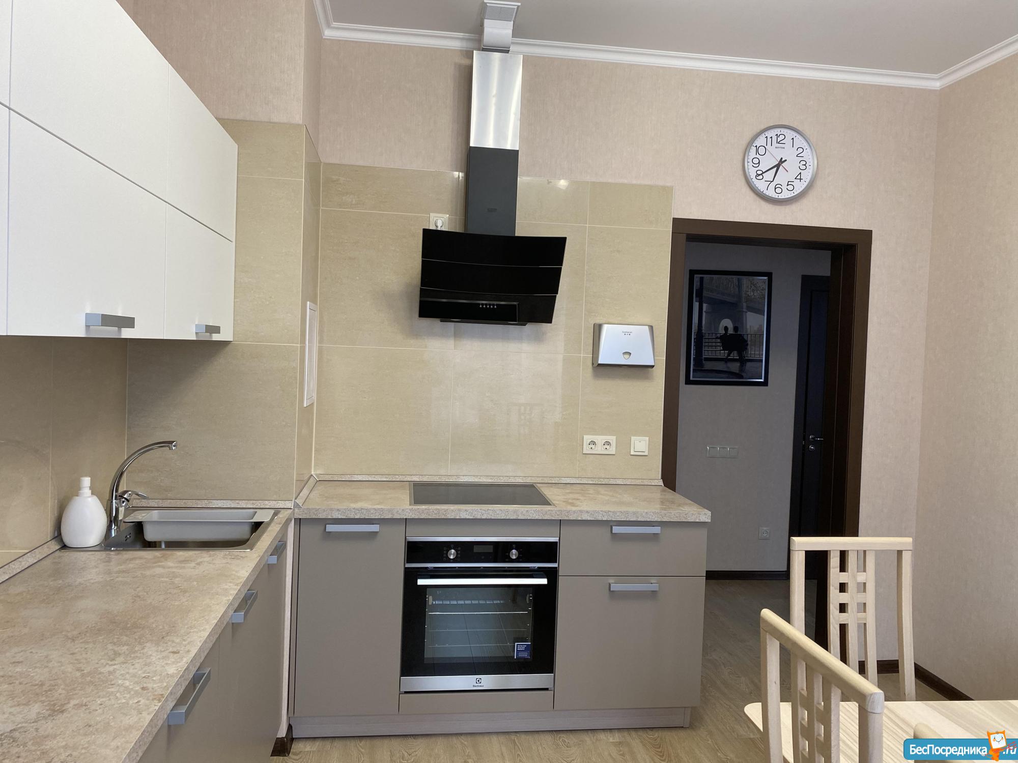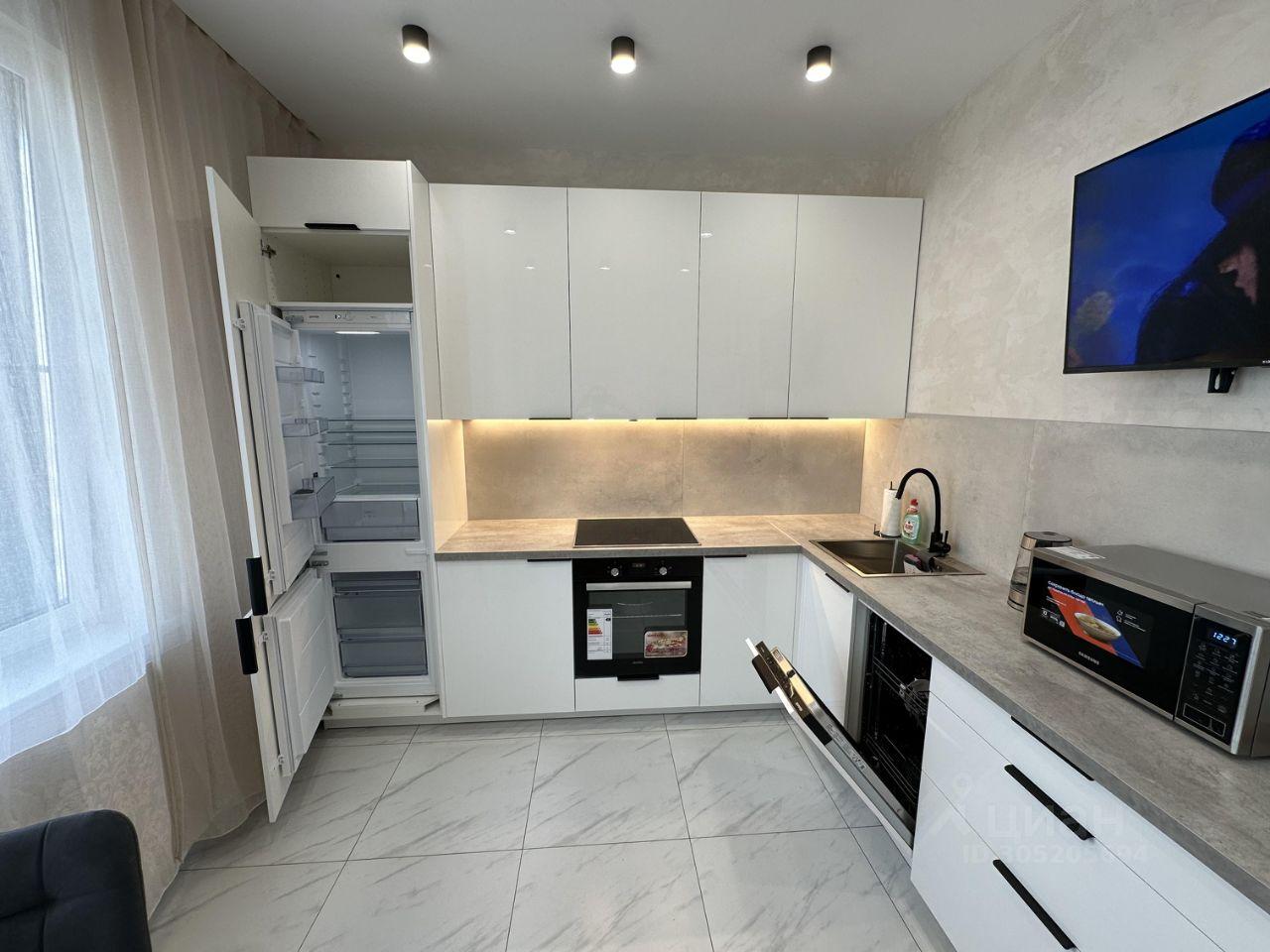Встроенная кухня с техникой: холодильник, варочная поверхность, посудомоечная машинка, духовой шкаф, вытяжка, телевизор.
