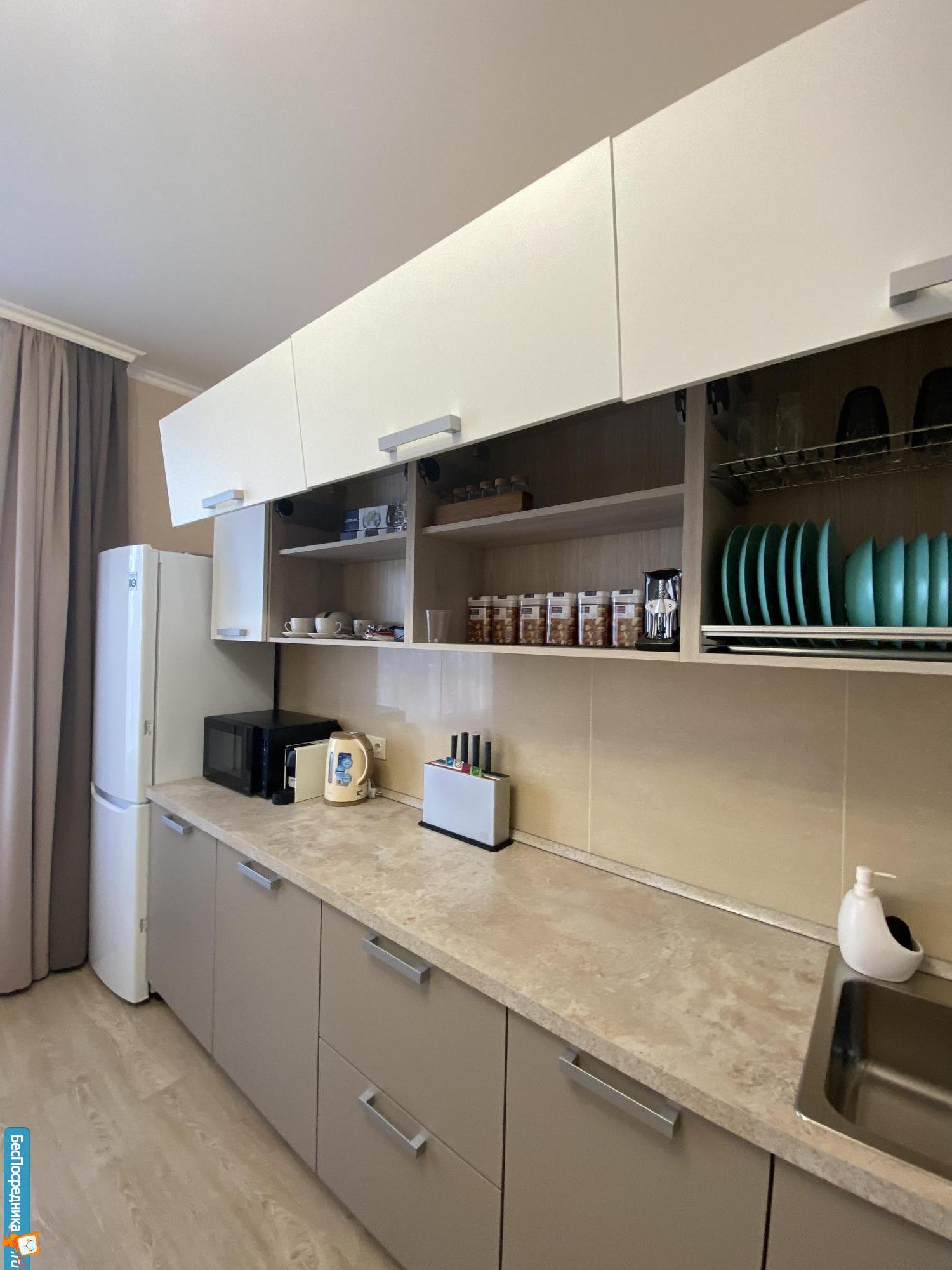 На кухни есть все необходимое : холодильник, посудомоечная машина, духовка и микроволновая печь