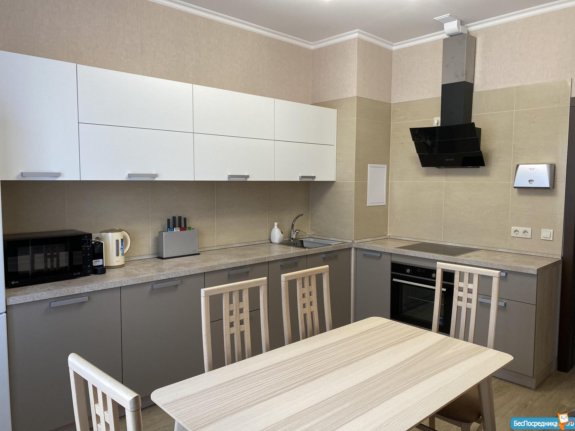 кухня с современной техникой (индукционной плитой, духовкой, посудомоечной машиной, холодильником , вытяжкой и СВЧ), угловым диванчиком со спальным местом, а также есть посуда, кастрюли и столовые приборы;