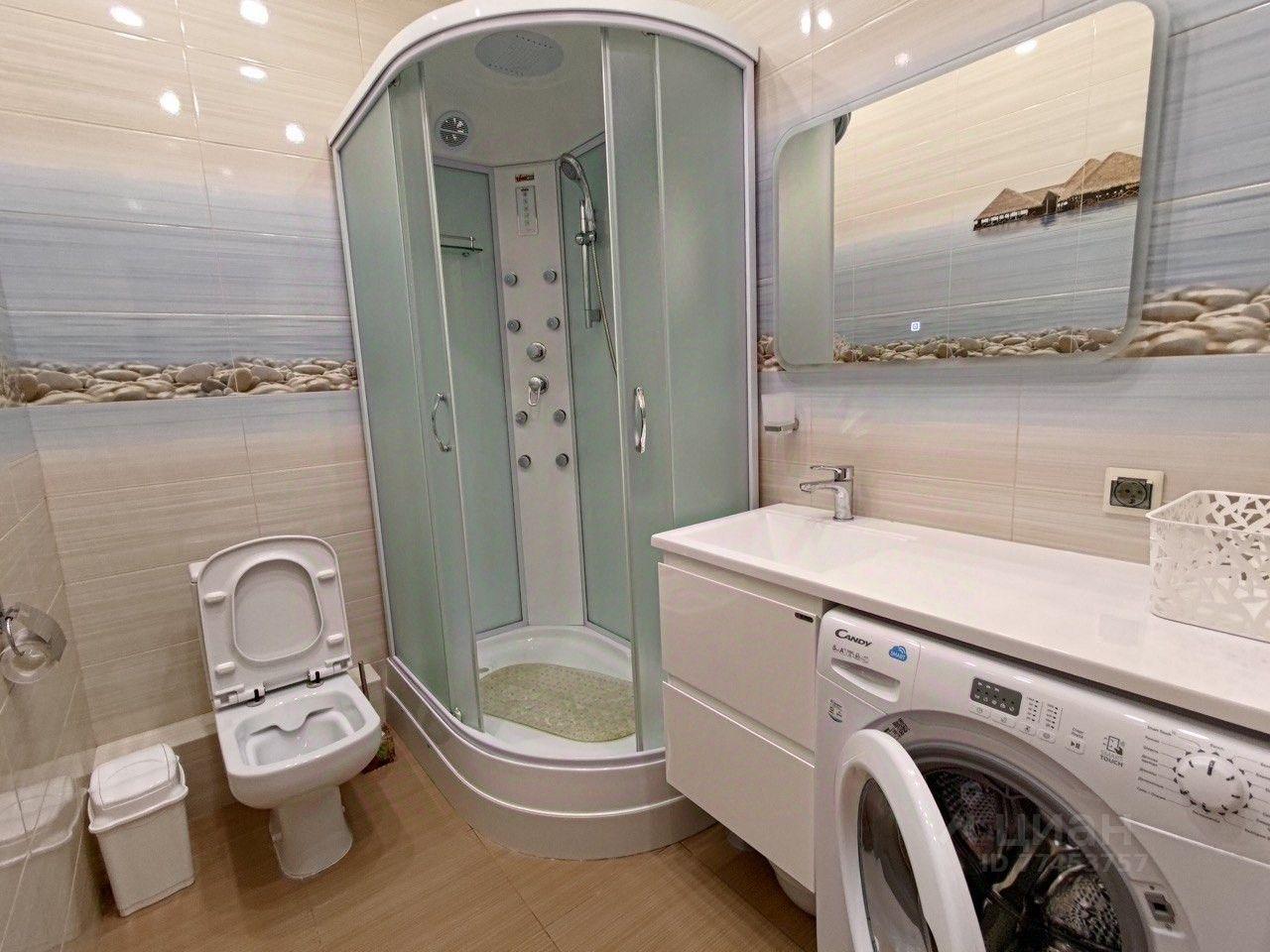 Ванная: душевая кабинка, раковина, зеркало, стиральная машинка, гигиенический душ, шкаф для хранения.