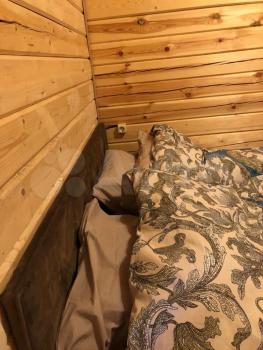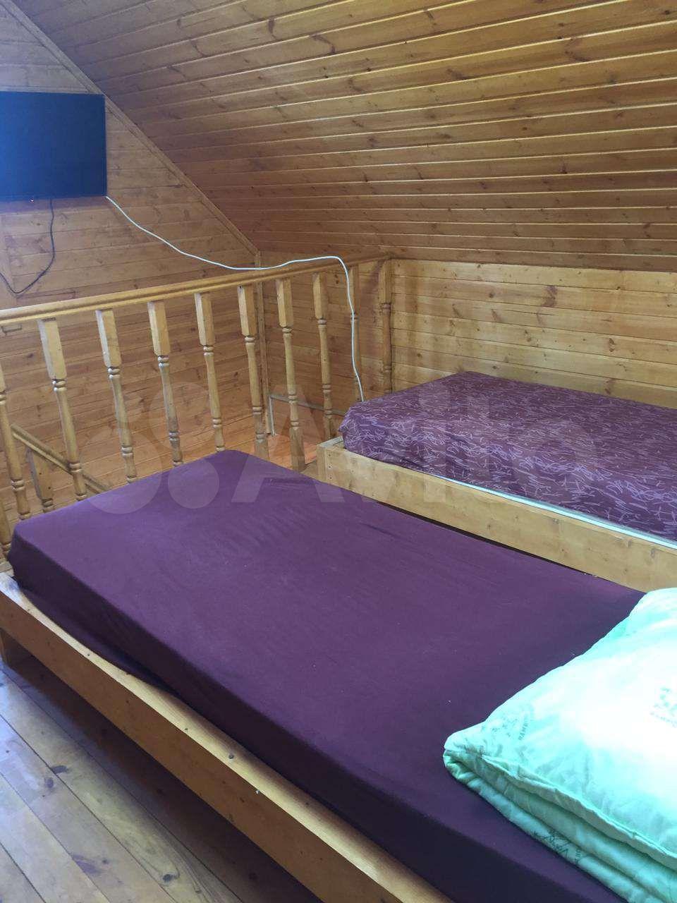 4 спальных мест: на втором этаже 3 односпальные кровати, на первом этаже диван.