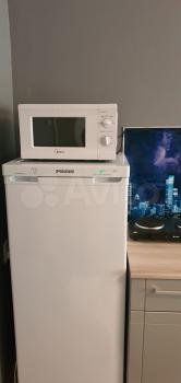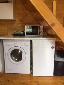 Кухня-гостиная с техникой: холодильник, микроволновка, плита. Душевая кабина, стиральная машина, ТВ.