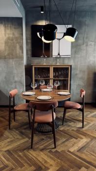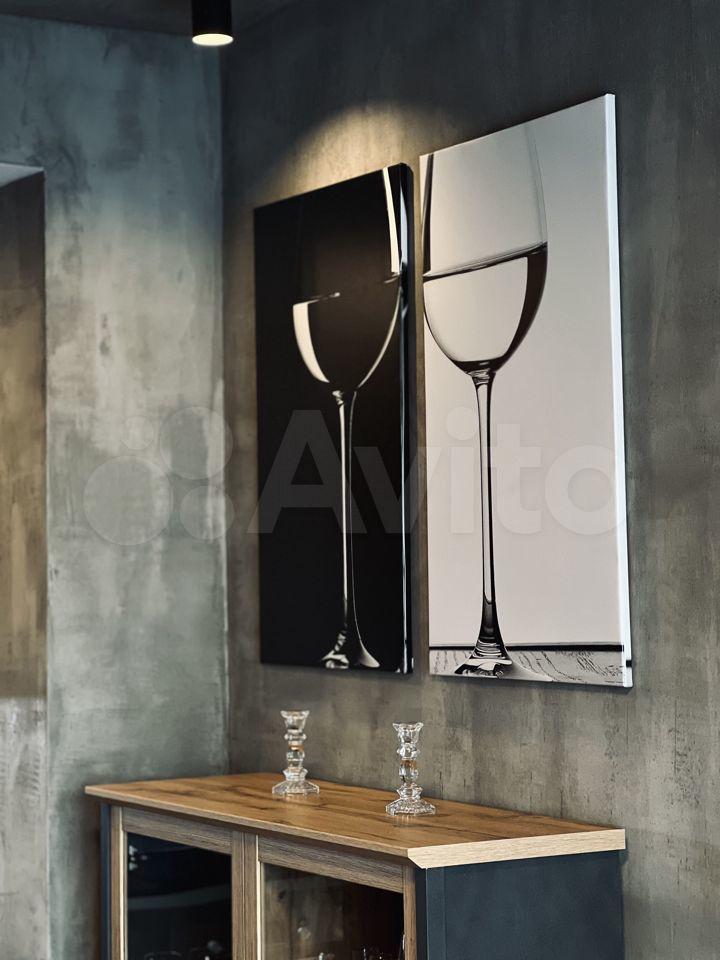 2. В кухне-гостиной выполнено зонирование. Кухня оборудована всей необходимой техникой: варочная панель, вытяжка, посудомоечная машина, встроенный холодильник, а также полным комплектом посуды и приборов. В гостиной установлен диван, подвесная тумба, телевизор с диагональю 55’ с функцией Smart TV.