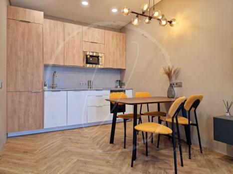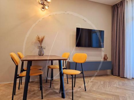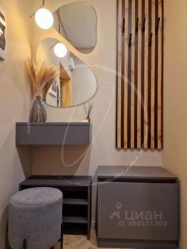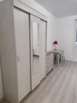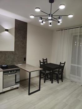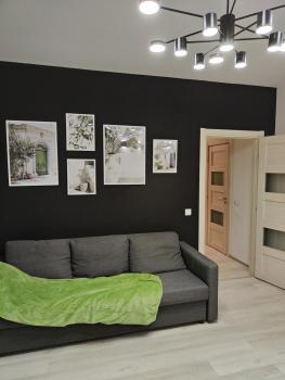 Новая квартира с ремонтом. Кухонная зона: кухня со всем необходимым (встроенная варочная панель, небольшой холодильник, выделена рабочая зона для ноутбука, обеденный стол, стулья, посуда, чайник и тд). Спальная зона: раздвижной диван, столик с настольной лампой,  шкаф. Есть большой балкон с полом из дерева, на балконе есть стеллаж. Ванная комната: паддон для душа, унитаз, раковина, стиральная машина. Прихожая: дизайнерская вешалка + обувница, дизайнерский светильник.  В квартире есть всё необходимое для жизни. Бытовая техника подключена. Всё новое. Удобная система освещения.