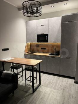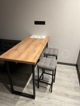 С зонированием: встроенная кухня с необходимой встроенной техникой, барный стол с мягкими полубарными стульями в стиле лофт, диван для отдыха и телевизор. Барный стол удобен и для приема пищи, и для работы.
