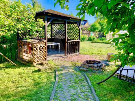 За домом, скрытая от чужого внимания зелёными насаждениями, зона отдыха с мангалом, гамаком и беседкой.