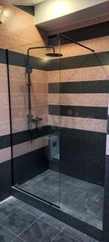 Стильный дизайн: черная стеклянная душевая кабина с душевой стойкой Gappo и тропическим душем, стиральная машина, зеркало с косметической подсветкой, встроенные места хранения, подвесной унитаз Grohe.