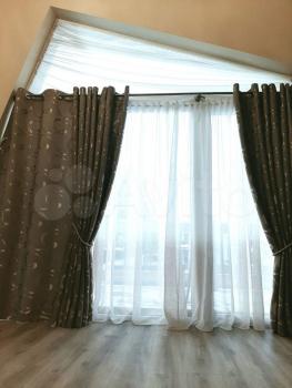 На лоджии безрамное остекление, отдельное освещение и установлены шторы.