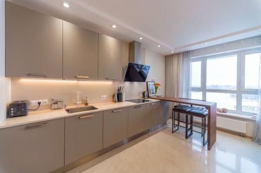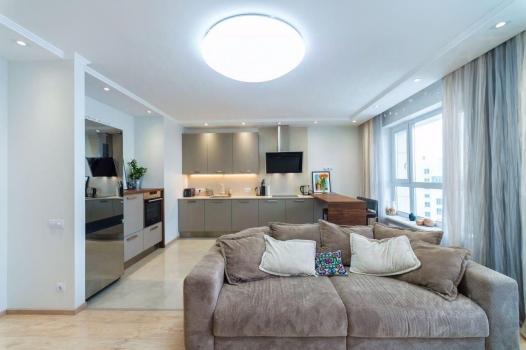 В квартире сделан стильный дизайнерский ремонт. Есть все необходимое для комфортного проживания: современная мебель на кухне и в комнате, а также полный комплект бытовой техники, включая кондиционер, холодильник, посудомоечную машину, телевизор и стиральную машину. Планировка квартиры продумана до мелочей: совместный санузел и отдельный санузел, а также лоджия с видом на улицу.