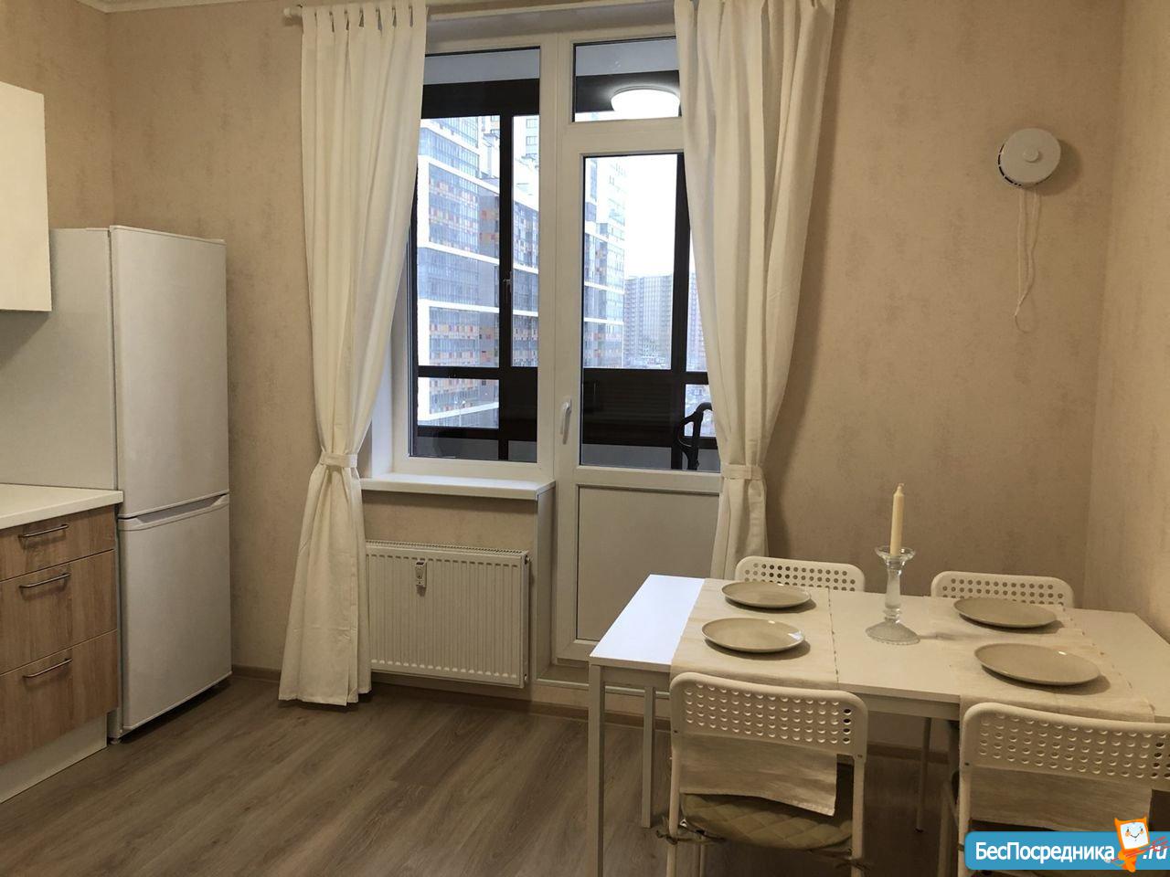 Новая квартира с видом на Санкт-Петербург. Место для парковки в охраняемом дворе со шлагбаумом. Во дворе детский сад и школа . Бытовая техника и частично мебель в наличии.