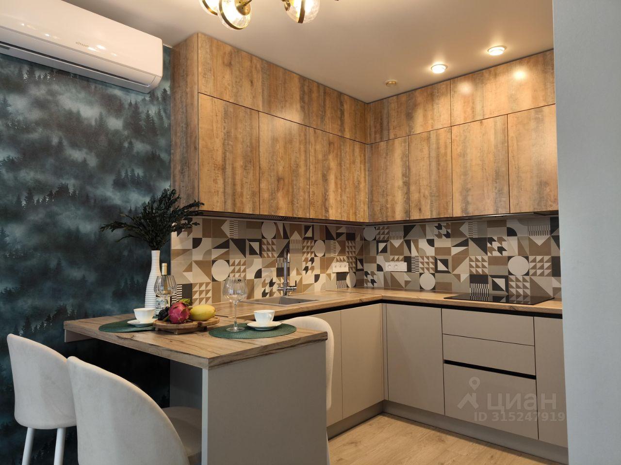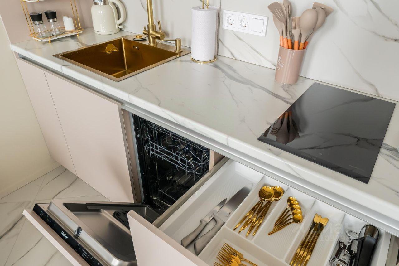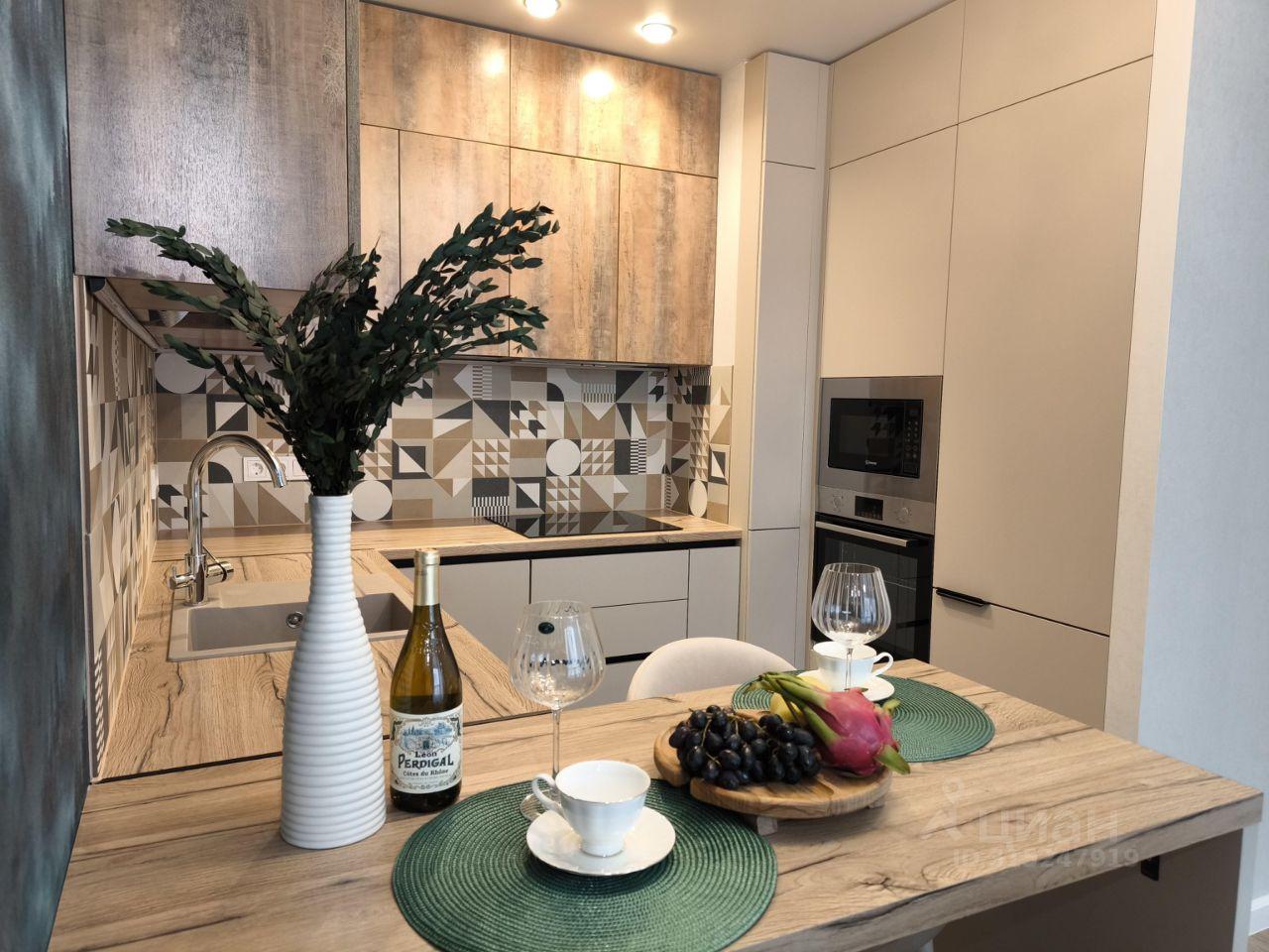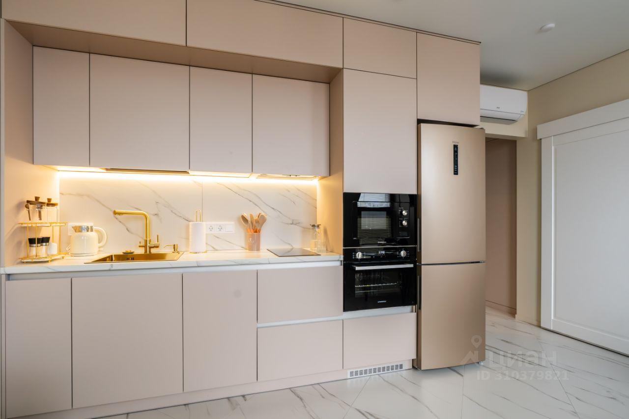 Кухня оборудована современной встроенной бытовой техникой: посудомоечной машиной, варочной поверхностью, духовым шкафом, микроволновой печью, холодильником. Барная стойка и полубарные кресла делают кухню стильной, подходят для активных и современных людей.