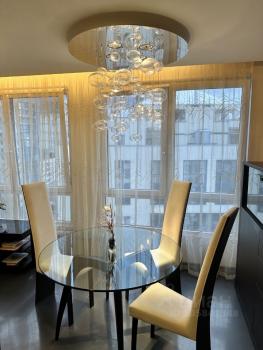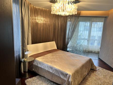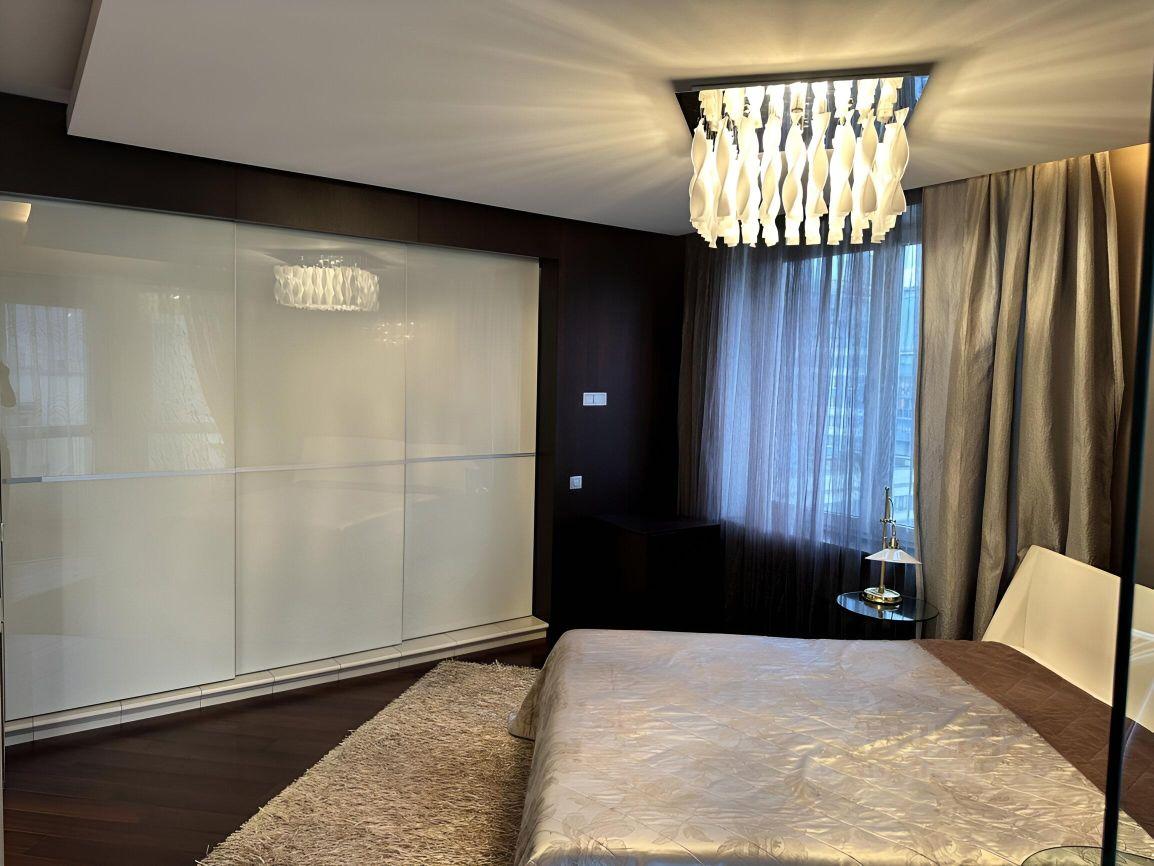 В спальне кровать с ортопедическим матрасом 180х200, 2 прикроватных стеклянных столика и отдельно туалетный столик. А также умопомрачительная люстра и светящийся шар за шторами!