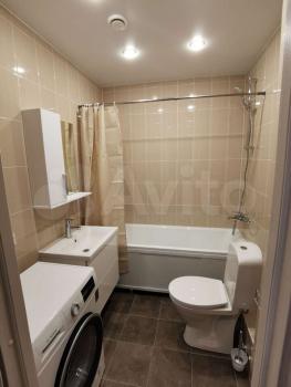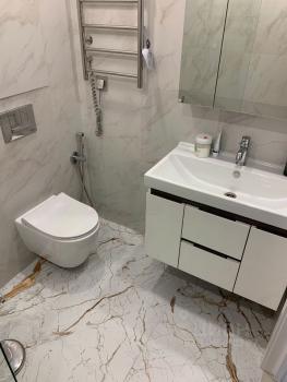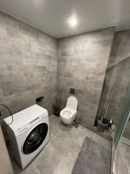 Современный санузел с новой сантехникой и стиральной машиной