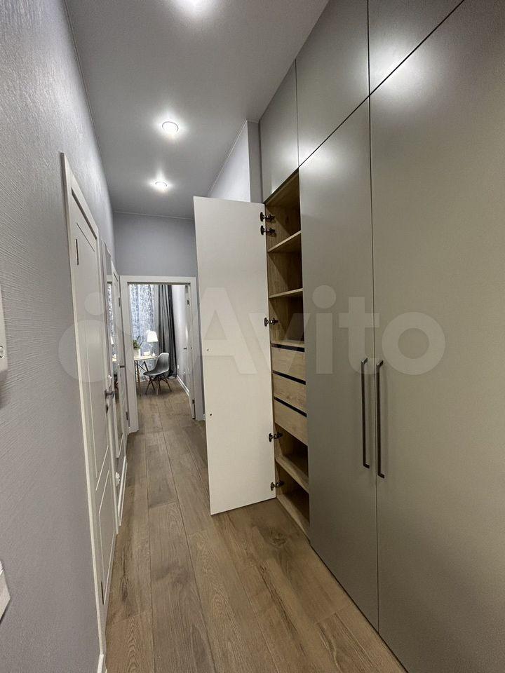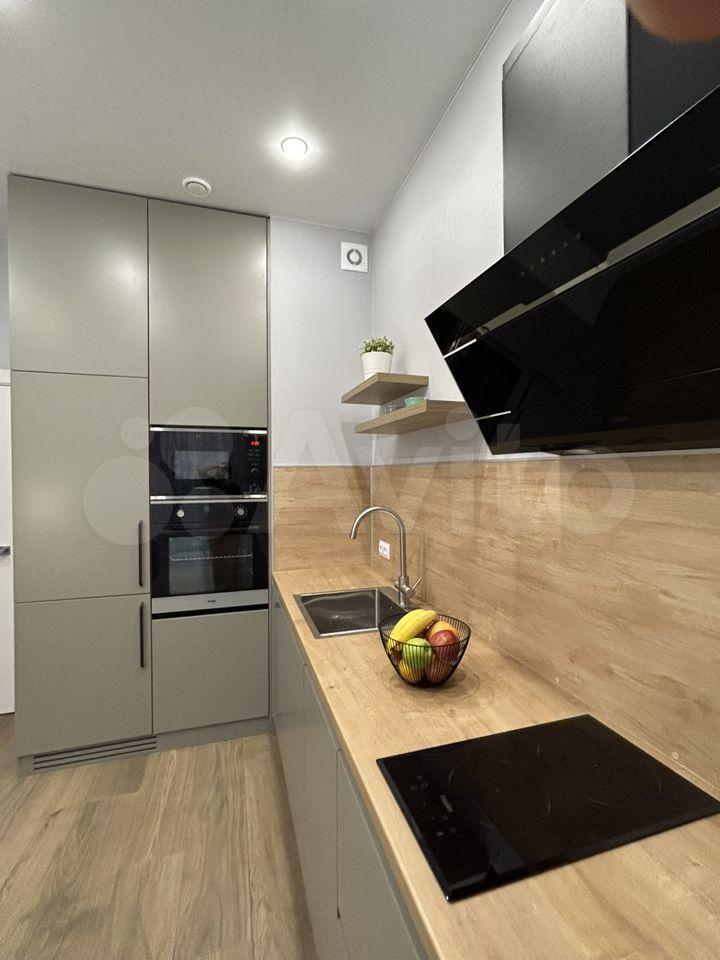 В квартире установлена техника и мебель, холодильник, духовой шкаф, индукционная плита, в комнате кровать 140 на 200, диван, места хранения, в ванной комнате стиральная машина на 8 кг. Теплые полы на кухне и в ванной.