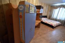 В комнате стоит диван, стенка и небольшой шкаф, также есть свободный угол в котором можно организовать рабочее место, или детскую кровать.