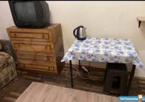 Комната (14м2), светлая, отдельная (не проходная), дверь прочная металлическая закрывается на замок, в комнате имеется: телевизор, микроволновка, холодильник, стиральная машинка(автомат), большая кровать(двухместная, раскладывается), стол, стул, шкаф, тумбочка, полки для хранения вещей и вешалка для одежды.