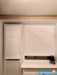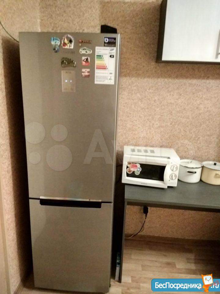 В комнате есть чайник, микроволновка, двухкамерный холодильник Samsung, двуспальная кровать, большой шкаф-купе, столик, компьютерный стол, навесной шкаф, рулонные шторы на окнах. В коридоре стоит стиральная машина.