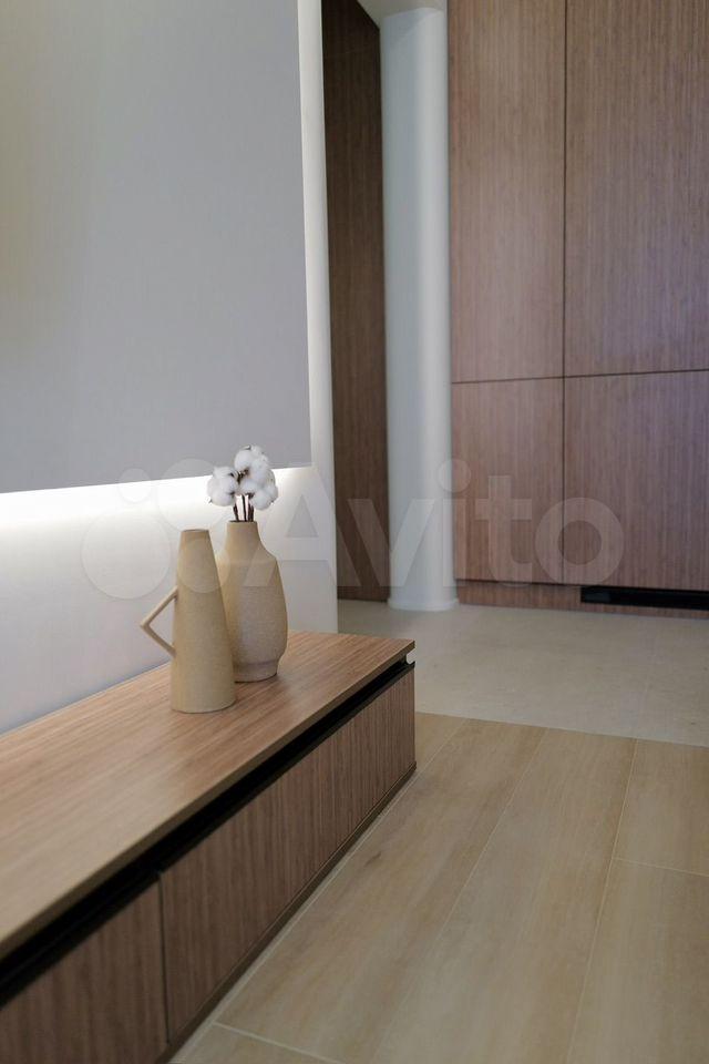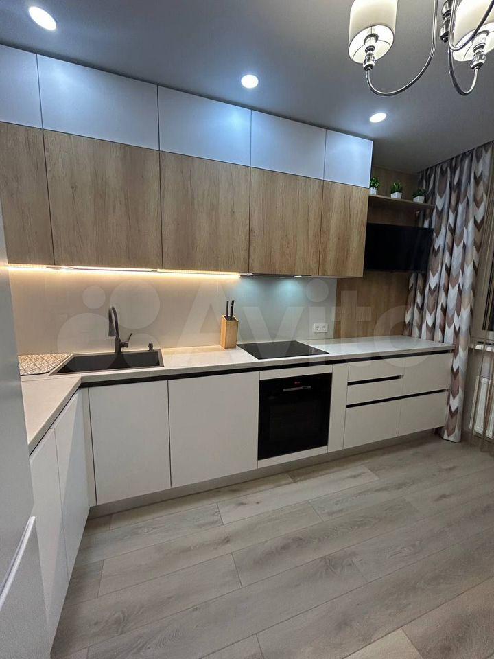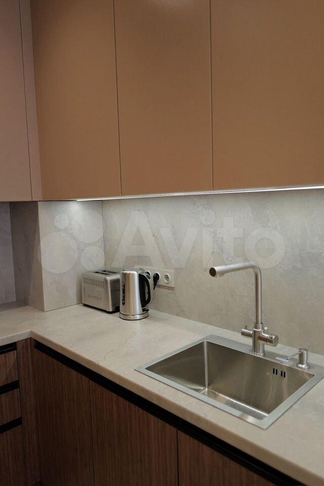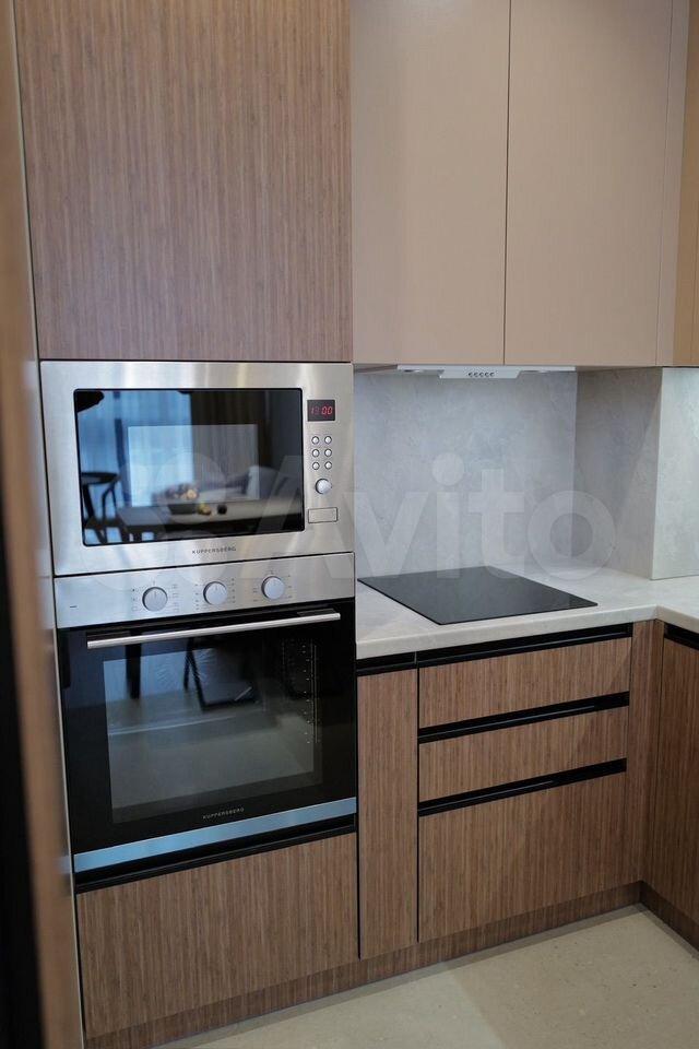Квартира оборудована кухней премиум-класса с доводчиками и встроенной техникой: посудомоечная машина, духовой шкаф, варочная панель на 4 комфорки, СВЧ, вытяжка, двухкамерный холодильник, чайник и фильтр для питьевой воды.