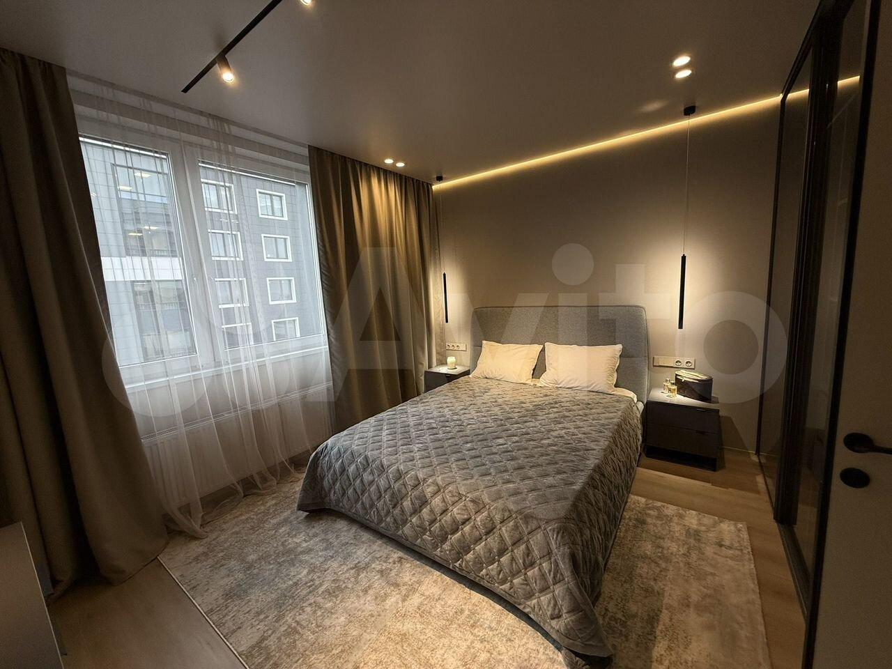 Спальня оборудована двухспальной кроватью с ортопедическим матрасом разной жесткости, вместительным шкафом и рабочим местом. Шторы блэкаут. Из спальни есть выход на просторную лоджию.