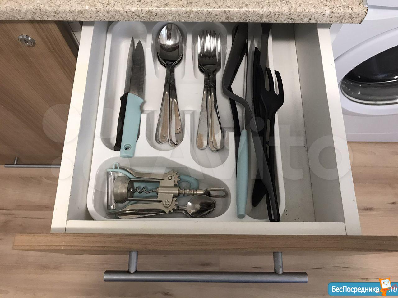 Диван в кухне раскладывается,тем самым, дополняя ещё 2 спальных места.