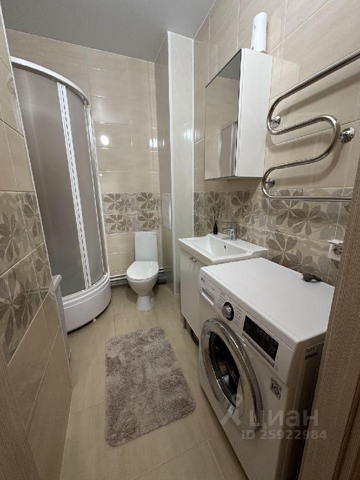 Светлый совмещённый санузел с душевой кабиной и отделкой, современная стиральная машина.