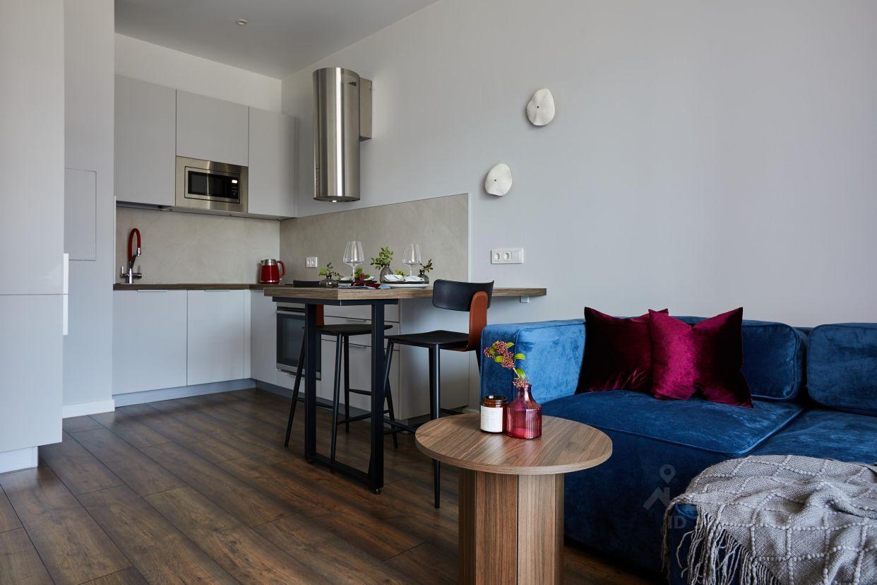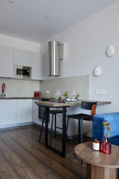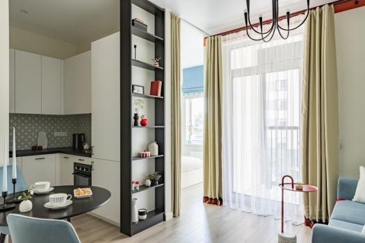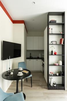 В квартире есть изолированная спальня 12 кв. метров, кухня-гостиная 16 кв. метров, лоджия, оборудованная местом для отдыха или работы, совмещенный санузел.