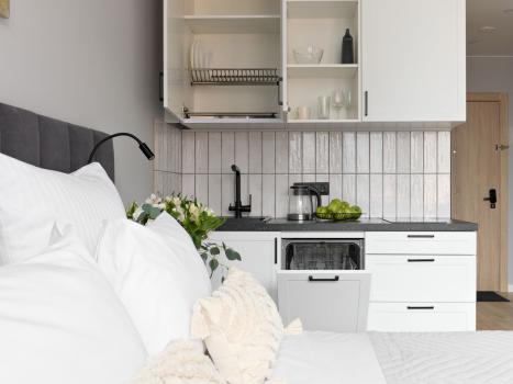 МЕБЕЛЬ: кровать с матрасом 160х200, вместительный шкаф для ваших вещей, совмещенная рабочая и обеденная зона с видом на панораму города, удобства для приготовления еды в номере. Шторы блэк-аут гарантируют вам крепкий и спокойный сон.