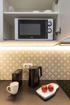 В квартире есть вся необходимая бытовая техника, чайник, мироволновая печь, варочная поверхность, встроенный фильтр для питьевой воды, духовка и кофемашина Nespresso. застекленная лоджия, шторы блэкаут и кондиционер
