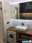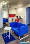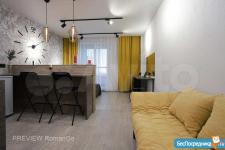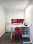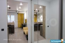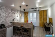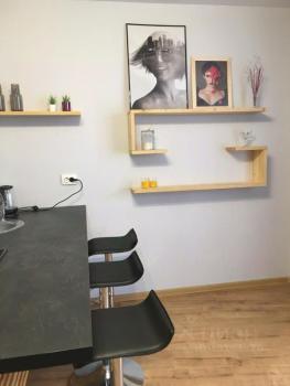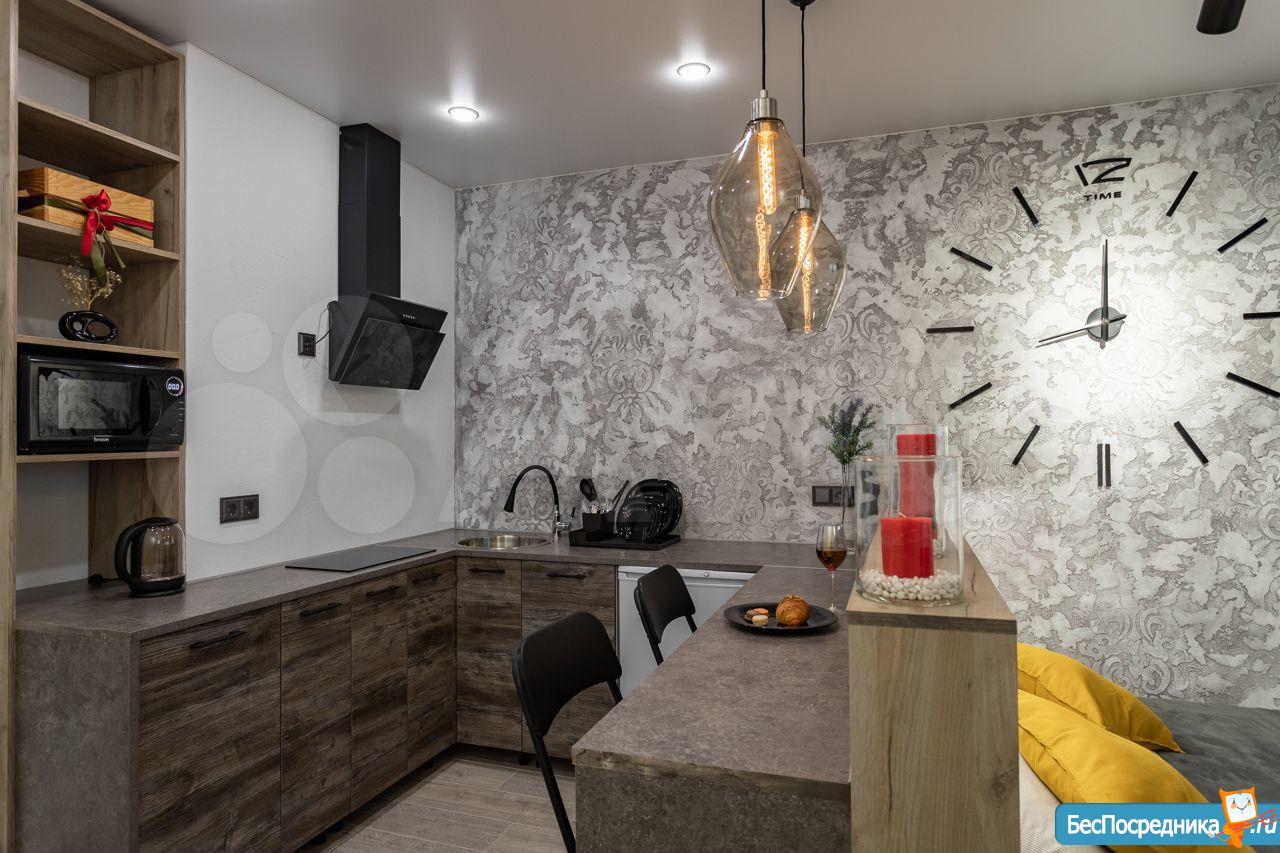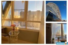 Однокомнатная студия расположена на 17 этаже. Ремонт сделан в 2021 году по индивидуальному дизайн проекту. Большая кухня с барной стойкой оснащена всем необходимым: плита, вытяжка, холодильник, посудомойка, СВЧ, комплект посуды и столовых приборов. Есть фен, утюг, гладильная доска, сушилка, вентилятор.