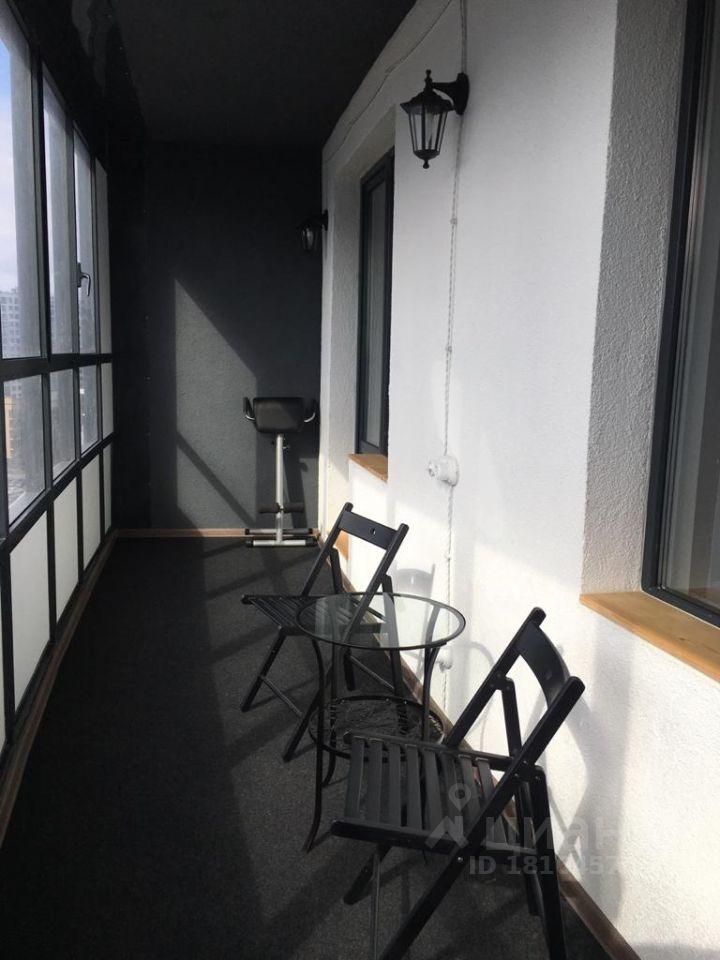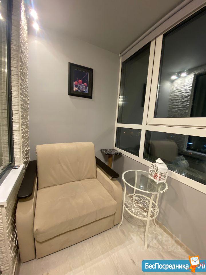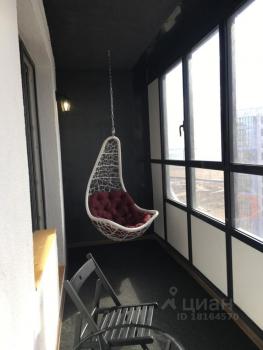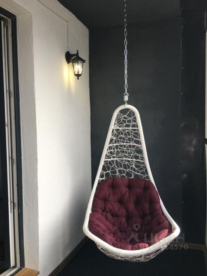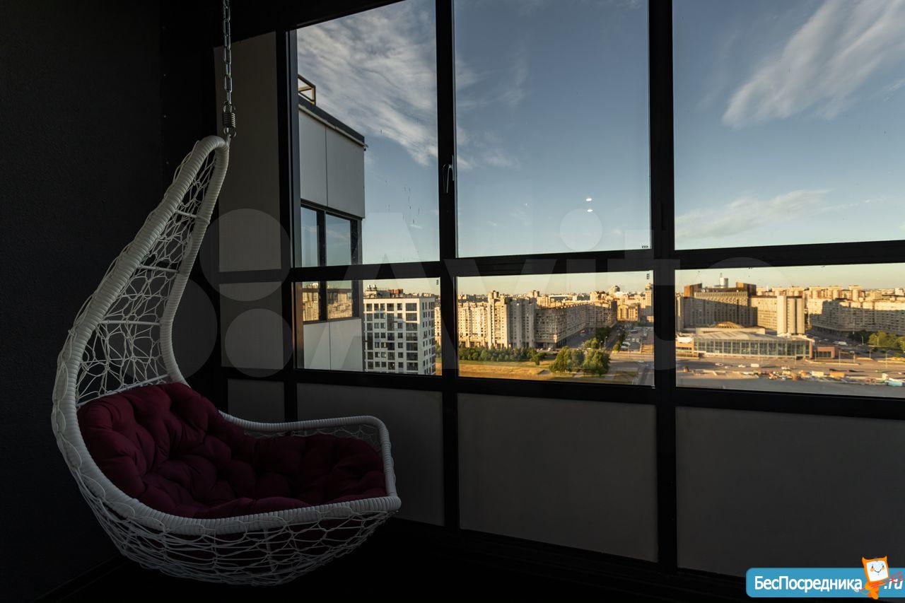 Из панорамных окон просторной лоджии открывается вид на весь город и площадь гостиницы Прибалтийская. На лоджии установлено подвесное кресло.