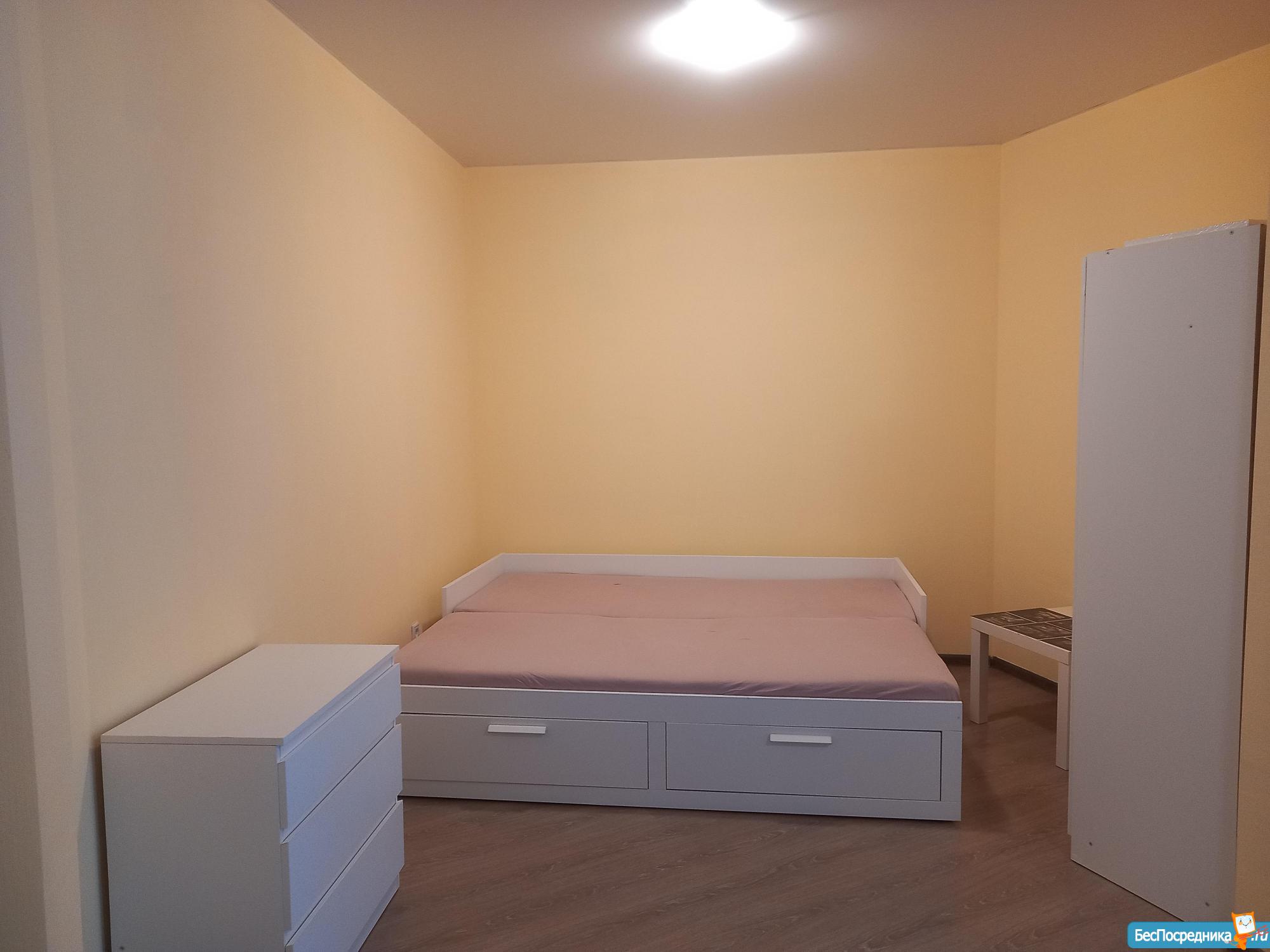 В квартире есть двуспальная кровать с ортопедическим матрасом 160х200, плюс диванчик на кухне.
