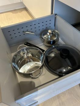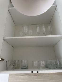 * В квартире: утюг, гладильная доска, шампунь, гель, мыло, мыло для посуды, чай, сахар, соль, кастрюля, сковородка, сотейник, вилки, ложки, ножи, интернет, пылесос.