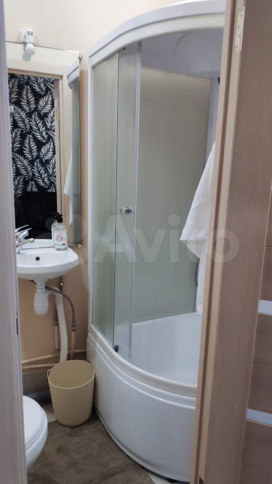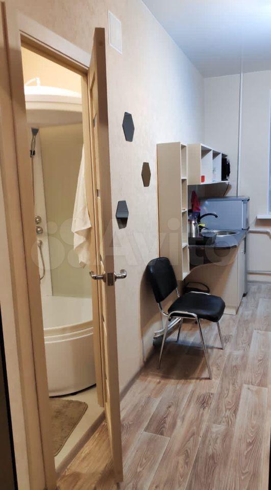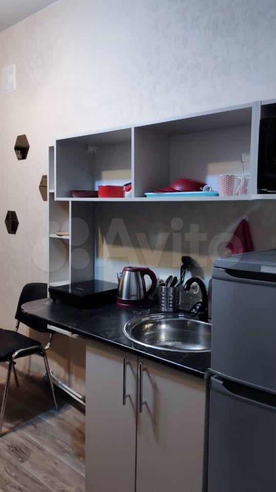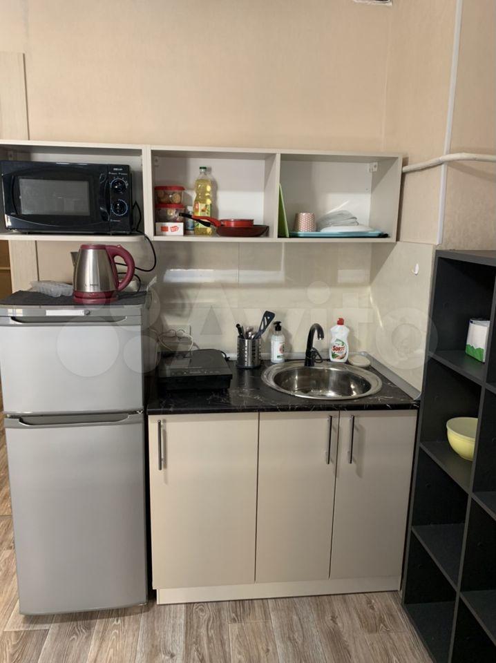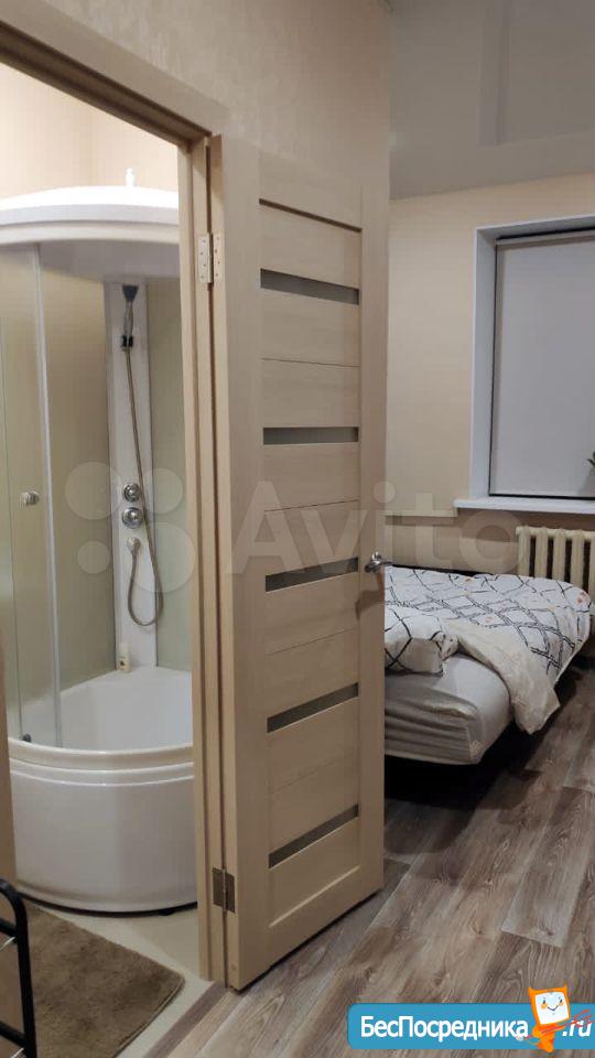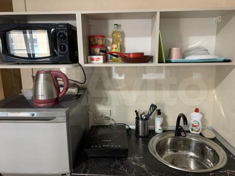 В студии: душевая кабина, туалет, водогрей(горячая вода постоянно), керамическая электрическая плита(любая посуда подходит), микроволновка, холодильник двухкамерный на 150л, электрический чайник, окно стеклопакет, рулонные шторы, набор посуды.