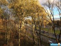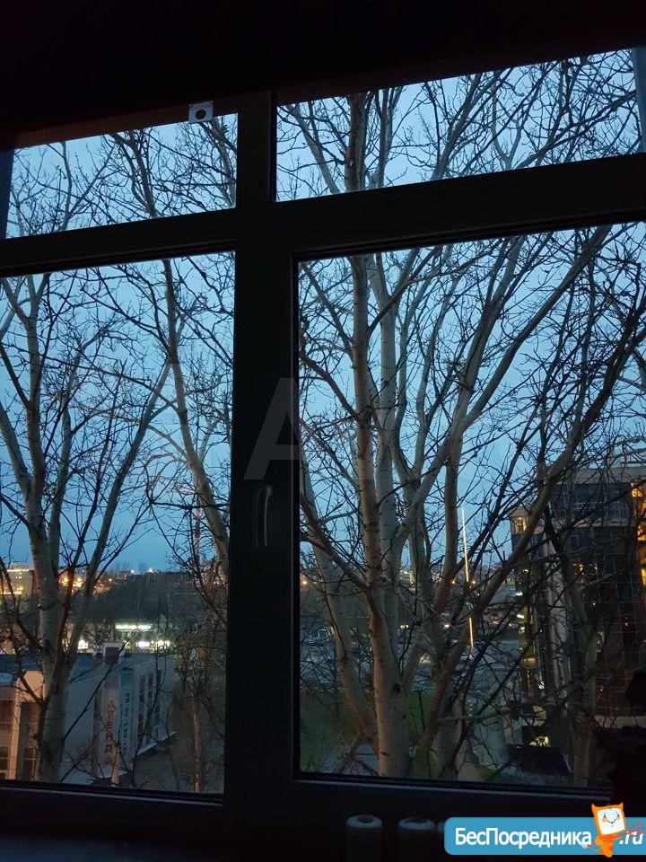 ?Oкнa выходят на зелёный сквер.