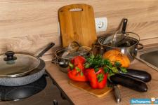 - Посуда (тарелки, кружки, стаканы, сковородки) и столовые приборы.