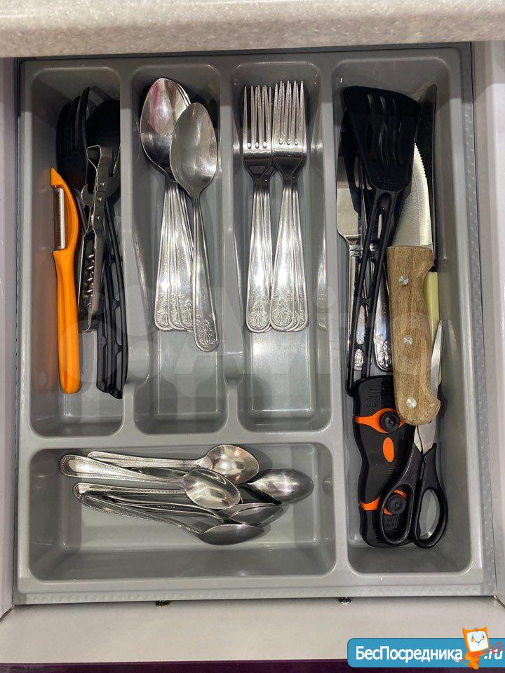 Кухня полностью оборудована (встроенная посудомоечная машинка, микроволновая печь, плита, духовой шкаф, холодильник, стиральная машина, диван угловой, чайник, посуда (набор кастрюль, сковородки, набор столовых приборов) смарт телевизор, кондиционер, стол и т.д.).