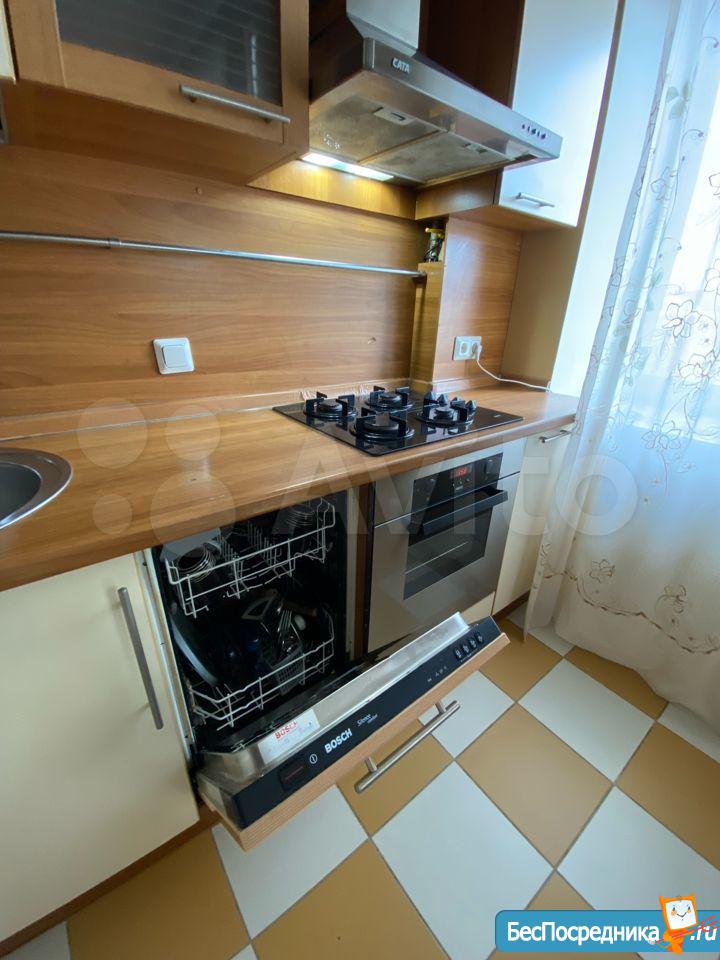 Кухня: обеденный стол на 4 человек, стулья, варочная панель, духовой шкаф, вытяжка, посудомоечная машина, микроволновая печь, двухкамерный холодильник, посуда
